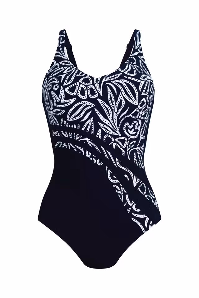 Dirban baddräkt har en klassisk stil med en klädsam snedskärning på framstycket. Den har en slimmande effekt medd dubbelt tyg i framstycket och medium support för lite mer håll-in. Axelbanden är reglerbara och och ligger skönt på axeln.Kuporna är lätt vadderade och ger stöd för bysten. Fickor på båda sidor (se ovan). Ryggen är lätt u-formad.