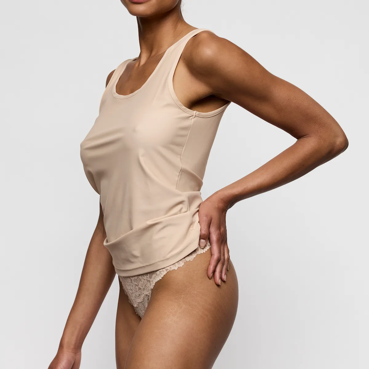 Ett slätt Linne med breda axelband och bekväm passform, härligt mjuk med bra komfort och osynlig under kläder. Linne med rund halsringning.