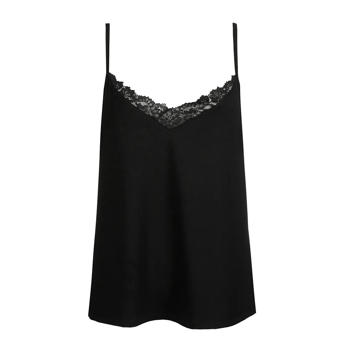 Linne med spagettiband och bekväm passform, härligt mjuk med bra komfort och osynlig under kläder. Linne med fin v-ringad spets mitt fram, baksidan är rak samt reglerbara axelband.