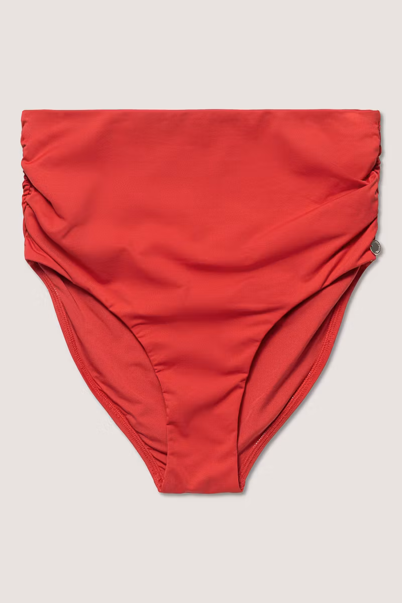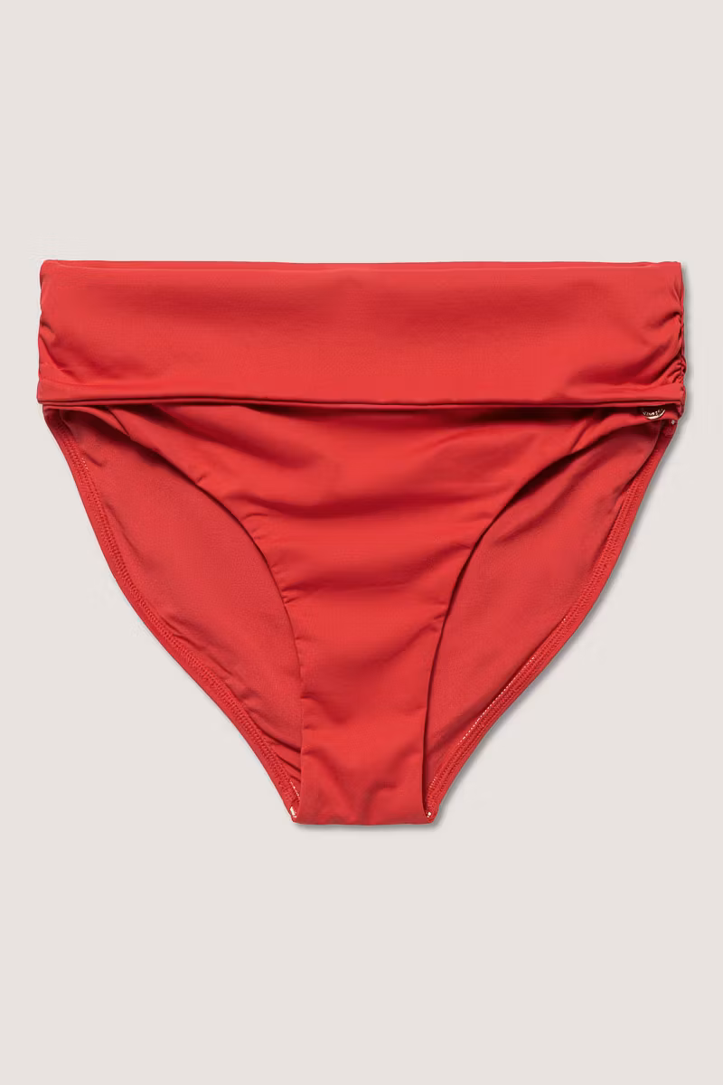 Bikinitrosa i en härlig röd färg. Trosa med vikbar kant. Den vikbara kanten är mjuk och elastisk vilket gör trosan fördelaktig för figuren. Bär den uppvikt för en högre modell eller vik ner kanten för en lägre trosa.