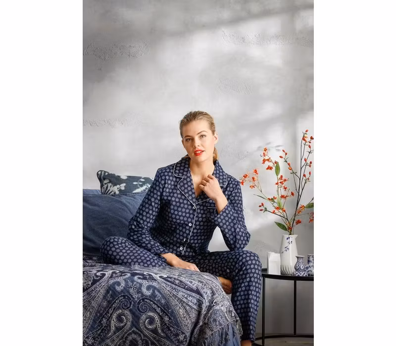 Tvådelad pyjamas. Lång ärm och långa byxor. Byxorna är raka med rakt avslut, har resår i midjan, samt dragsko. Jackan har knapplås med vita knappar och vita revärer längs knapplåset och ärmarna. Jackan har krage.