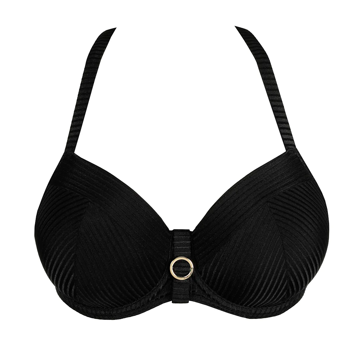 Snygg vadderad balconett bikini bh med bygel. Enfärgad svart med vävda ränder i tyget. Reglerbara axelband som kan kopplas om till halterneck eller i kryss rygg. Fin dekorativ ring mitt fram i guldfärg.