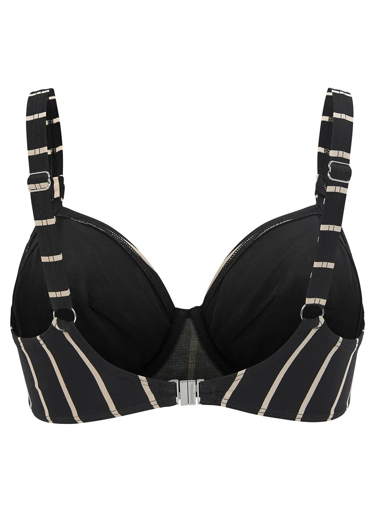 Bikinibh med klassiskt randning i svart och beige. Ofylld bh med bygel. En bikini-BH med stadigt foder och sidostöd som ger extra bra stöd och håller bysten på plats. Snygg och enkel bikini-BH som verkligen sitter som en vanlig BH. Ofyllda kupor ger dessutom snabb torktid. Justerbara axelband med nickelfria ringar och spännen med knäppning bak.