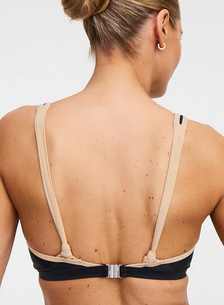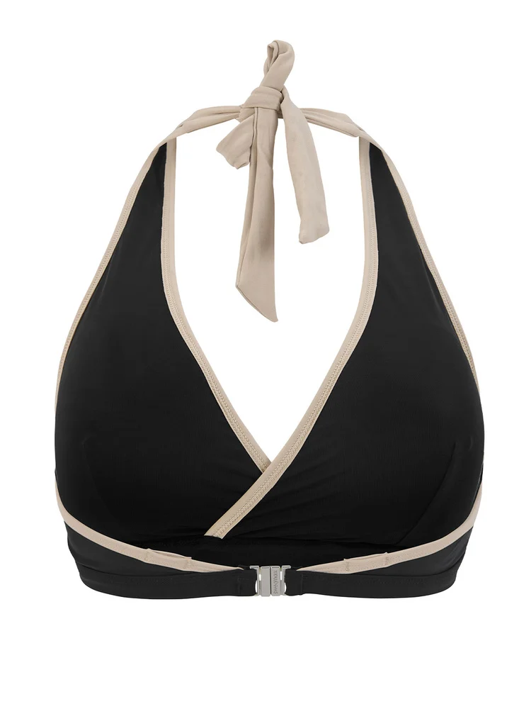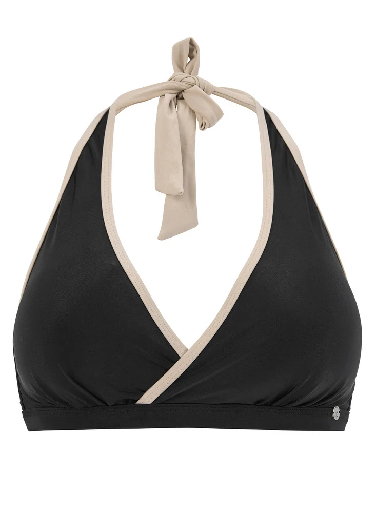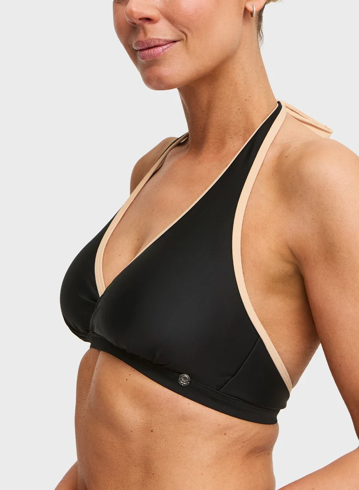 Maui bikini-bh i halterneck modell med vadderade kupor som går lite omlott mitt fram, vadderingen är uttagbar. Bikinitoppen kan justeras efter dina behov, växla mellan halterneck, korsad i ryggen eller med enkla axelband. Mjuk och skön bikini-bh, tillverkad i återvunnet material.