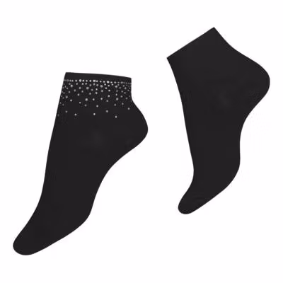 Silkesmjuk lite lägre ankelsocka som andas och som är temperaturreglerande. Kettlad tå (ingen söm). Glittriga små stenar runt hela ankeln.